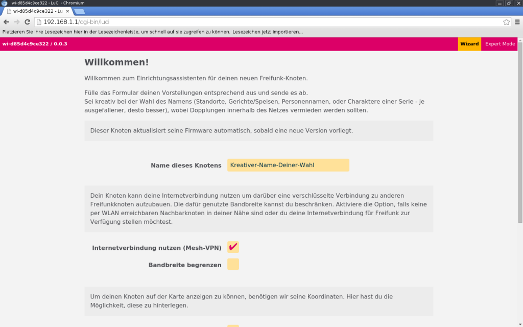 Als Erstes gibst du deinem Knoten einen Namen. Nimm einen, der dir gefällt und der vielleicht ein wenig über den Standort des Knotens aussagt. z.B. FreeWayLan. Bitte achte darauf, dass keine Sonderzeichen außer der Bindestrich im Namen erlaubt sind. Wenn du ein Leerzeichen brauchst, verwende einen Bindestrich.